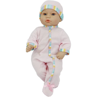 - Adorable realistic 14″ baby with light skin, blue eyes.