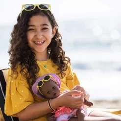 Rosy cheeks & freckles APPEAR in the sun! Size: 13″” Adora Doll Dark skin tone/brown eyes Fresh baby powder scent Exclusive QuickDri body Sweet ADORAble doll face My eyes open and close I can suck my thumb 100% Machine Washable 4-piece set comes with a washable baby doll, a trendy swimsuit top, a bucket hat, and yellow sunglasses Encourages nurturing and pretend play Ages 1 and up Its beach time! Adoras interactive soft baby doll Beach Baby Piper will add magic to your beach play with her sweet ADORAble baby doll face and fun uv-activated features! Take this 13-inch baby doll with you out of the shade and watch as her rosy cheeks and freckles appear in the sun. Beach Baby Piper comes dressed in a fun & trendy ruffled swimsuit top partnered with a purple bucket hat to style. To add more cuteness to this already cute doll, Piper also arrives with yellow brimmed sunglasses to protect her eyes as she brings endless hours of fun in your little ones beach and other outdoor play. Adora Beach Baby Piper is a washable baby doll measuring 13 inches from head to her tiny little toes. She has a dark skin tone, hand-painted brown hair, brown eyes that open and close, and open baby lips fit to put her thumb in when shes in need of soothing. Made from exclusive QuickDri body that dries in no time, Beach Baby Piper is the perfect Adora doll for toddlers who love fun in the bath, pool, beach, or lake! Safety tested and made with love for ages 1 and up. Looking for more interactive dolls? Browse our Beach Babies Collection and other sunlight-activated toy collection to add fun in your play!