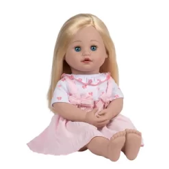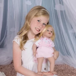 15″ tiny toddler baby comes with one-piece dress with butterfly patterned and ruffled neck-lined top, and skirt with bow and socked detail, and pink comb, and 2x pink scrunchies.