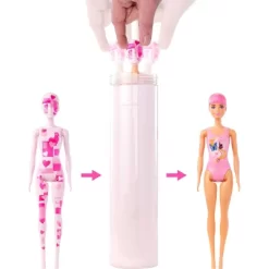 - Start the reveal experience by removing the outer layer of packaging, opening the tube, and pulling out a Barbie doll whose look is covered in a Color Reveal pink patchwork coating and surprise bags!