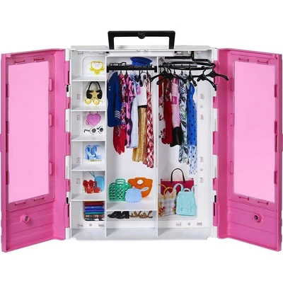 Product DescriptionPack Barbie doll for a world of possibility! The Barbie Ultimate Closet is designed for portability with a carrying handle. Decorated with Barbie signature style, the pink closet features translucent doors for a peek into the wardrobe. Six included hangars help keep fashions fashionable, and lots of shelf space is perfect for the amazing accessories. A fold-out rack helps role-play dress-up fun. The easy carrying handle keeps the portable closet ready to travel, anywhere, for any occasion, because when a girl plays with Barbie, she imagines everything she can become! Includes portable closet and six hangers; doll not included. Colors and decorations may vary.