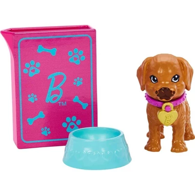 Barbie doll is adopting puppies with the Pup Adoption playset. Storytelling pieces let young animal lovers become a new dog owner and care for, nurture and train two adorable puppies. Color-change transformation adds role-play fun to feeding and potty time, and a working pet carrier expands nurturing play. Doll cannot stand alone. Colors and decorations may vary.