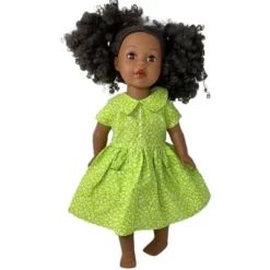 One of our most popular designer dresses in very popular lime greenWhen laying flat, the dress measures 14″ at the empire waist and is 32″ from shoulder to hemline. Perfect for tall girls or girls who like long dressesThe matching doll dress will fit 18 inch girl dolls like American Girl Our Generation My Life dollsThis listing is for one girl and one doll dress. The doll and shoes are not included.