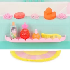 - Includes: An ocean-themed bathtub, towel, bath mat, rubber duckie, hair clip, comb, and set of pretend cosmetics such as a face mask and mist bottle.