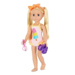 Discover fun adventures in bright styles with the Glitter Girls Suitcase & Fashion set for 14-inch dolls! Pack for dazzling journeys with the colorful suitcase as you prepare for trips around the world. It opens to fit all 3 stylish outfits, and it features rolling wheels to easily travel to your favorite spots. Dress for the beach with the cute ice-pop-print swimsuit and add the stylish hair bow accessory for a splash of fun. Or plan for a party in the star-print dress with the matching jelly sandals and heart-shaped glasses! When itโs nighttime, change into the comfy rainbow pajamas to keep cozy, then pack up the suitcase and travel to more sparkling destinations โ the Glitter Girls World is always filled with wonder! (Dolls sold separately)