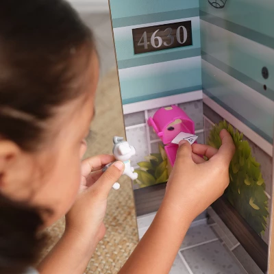 Furry creatures are welcome in the Purrfect Pet Dollhouse by KidKraft. Animal-loving kids will pawsitively love this almost 3-foot-tall house designed with pets in mind. Every detail on each of the three levels caters to dolls and their best friends. There’s a spot to hang the leash by the front door after a walk. Feed pets their dinner in the kitchen with the bowls and pet food. Take them through the doghouse outside to the patio area for a dip in the bone-shaped pool. Afterwards, head upstairs using either the traditional steps or place the pet in the elevator that glides along the side. Give the pet a bath in the laundry room specially built with handheld shower and grooming station. There are even cat perches on the walls for relaxing. Settle down for the night on the top level. There’s a bed for up to 12” dolls plus a cat bed and a dog bed so everyone’s comfy and cozy. With both cat and dog figures included, it’s sure to be a pet-tastic time. KidKraft dollhouses are made of wood for long-lasting fun.