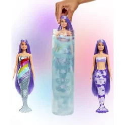Barbie Color Reveal dolls deliver an unboxing experience full of surprises -seven of them to be exact, but you only get one !A doll with a colorful mermaid tail is guaranteed, but each doll’s look remains a mystery until revealed. The packaging is part of the fun -pull the strip to remove the outer layer and reveal a clear tube. Inside are a Color Reveal mermaid doll, whose full look is hidden behind the metallic blue rainbow-print coating, and four bags with surprises. Remove everything and fill the tube with warm water, then insert the doll and swirl around. The water turns a shimmery sea blue, and when the doll is pulled out, their features are revealed! Each mermaid doll represents a different color of the rainbow with long hair and a pattern on the tail, but the surprises continue…open the bags to discover a fin, wrist cuffs, crown and sponge-comb accessory. Color-change effects on the doll’s arms and top add to the surprise and fun. Each series has a unique theme -these Color Reveal dolls are all about rainbows and mermaids. Use the tube to store these and other favorites. Which doll will you reveal Kids can collect them to mix and match accessories and expand the possibilities! Each sold separately, subject to availability. Dolls cannot stand alone. Colors and decorations may vary.