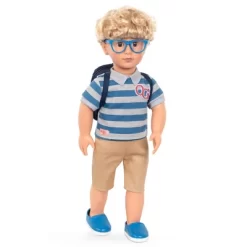 Learn your favorite subjects with Leo, the Our Generation 18-inch boy doll who loves everything about school! Leo has short, wavy blond hair and dark-brown eyes that open and close, and he can rotate his neck, arms, and legs to easily change outfits for each day he attends class. He arrives wearing a blue-and-gray striped polo with an OG crest, casual shorts, and sky-blue shoes with matching glasses. He also has a sporty backpack with comfy straps to carry books and other school supplies! Welcome Leo to the Awesome Academy schoolroom and introduce him to all your friends! (OG Awesome Academy Schoolroom sold separately)