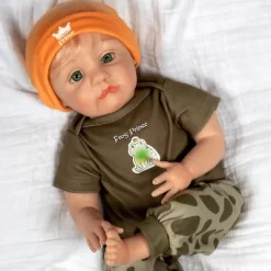Frog Prince includes a frog-themed ensemble featuring a soft jersey knit green shirt with Frog Prince print and a frog-spotted jersey knit pants. Smooth away his blonde hair wisps from his forehead and style it with his golden yellow knit beanie. Every second with this boy is a moment to be cherished. Give Frog Prince a cuddle as he takes his magnetic pacifier between his lips while hugging his soft frog lovie blanket with tender love! Paradise Galleries Frog Prince lovingly sculpted by world-renowned doll artist Pat Moulton. This realistic toddler boy doll is 20 inches from head to toe, crafted from SoftTouch Vinyl with a weighted cloth body for that wonderfully lifelike feel with a fresh baby powder scent. Arriving in a Collectors Box along with a numbered Certificate of Authenticity with the artists signature. Intended for reborn doll collectors aged 3+.