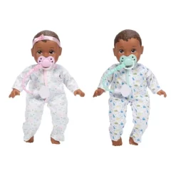 Your little one will adore doubling baby doll fun time with their very own set of Perfectly Cute 14” My Sweet Baby Doll identical TWINS! Dolls comes delightfully dressed in matching dinosaur printed onesies in two color ways. Each My Sweet Baby twin features a soft’n’cuddly body with easy-to-wipe-clean, durable hard plastic arms, legs, & head. Coordinating pacifiers, bottles, and pacifier clips also included! They’re the identically sweet addition to every baby doll collection!