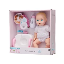 This Feed & Wet set includes everything you need to care for your little one. Feeding & potty time is super fun with the Perfectly Cute Feed & Wet Baby Doll set. Feed the baby water from its bottle and the baby “wets” its diaper. The diaper will even change colors! Adorable set features a snuggly sweet Perfectly Cute 14″ Baby Doll in a delightful removable shirt, bottle, potty seat, and a diaper.