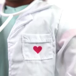 Lend a helping hand when someone asks, is there a doctor in the house! Enter the fast pace world of health care and learn what it means to help others. Show those in your care, compassion, empathy, and your amazing bedside manner with the Doctor Playtime Pack. This 11 piece set includes: A set of classic mint green scrubs, a white doctor’s lab coat embellished with a pink heart on the pocket matching shoe covers, a stethoscope, x-ray and medical chart, functioning clip-board, and mask. Also included is a color and mail post card activity allowing your child to share with someone special, the fun they’re having while playing with this adorable set from Playtime by Eimmie.