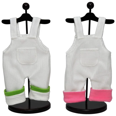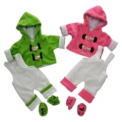Adorably comfy and cozy is the best way to describe this pair of complete outfits sized for 15″ Bitty Baby Twin dolls. Wonderful combination of corded fleece overalls, white jersey knit long sleeve tee, one soft jersey knit and fleece hooded jacket. One outfit in Pink and another in Soft Green. Detailing includes rolled-up pants legs on the overalls. Jackets feature wooden toggle style button closure. Booties included! Set of Two -making these perfect for Bitty Twins. Exclusively made by The Queen’s Treasures, offering the highest quality 18 inch Doll Furniture, 18 inch Doll Clothes, 18 inch Doll Shoes & 18 inch Doll Accessories! Safety Tested!