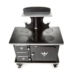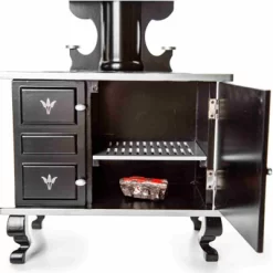 - Wooden stove features an oven, warming shelf and a firebox with faux fire.